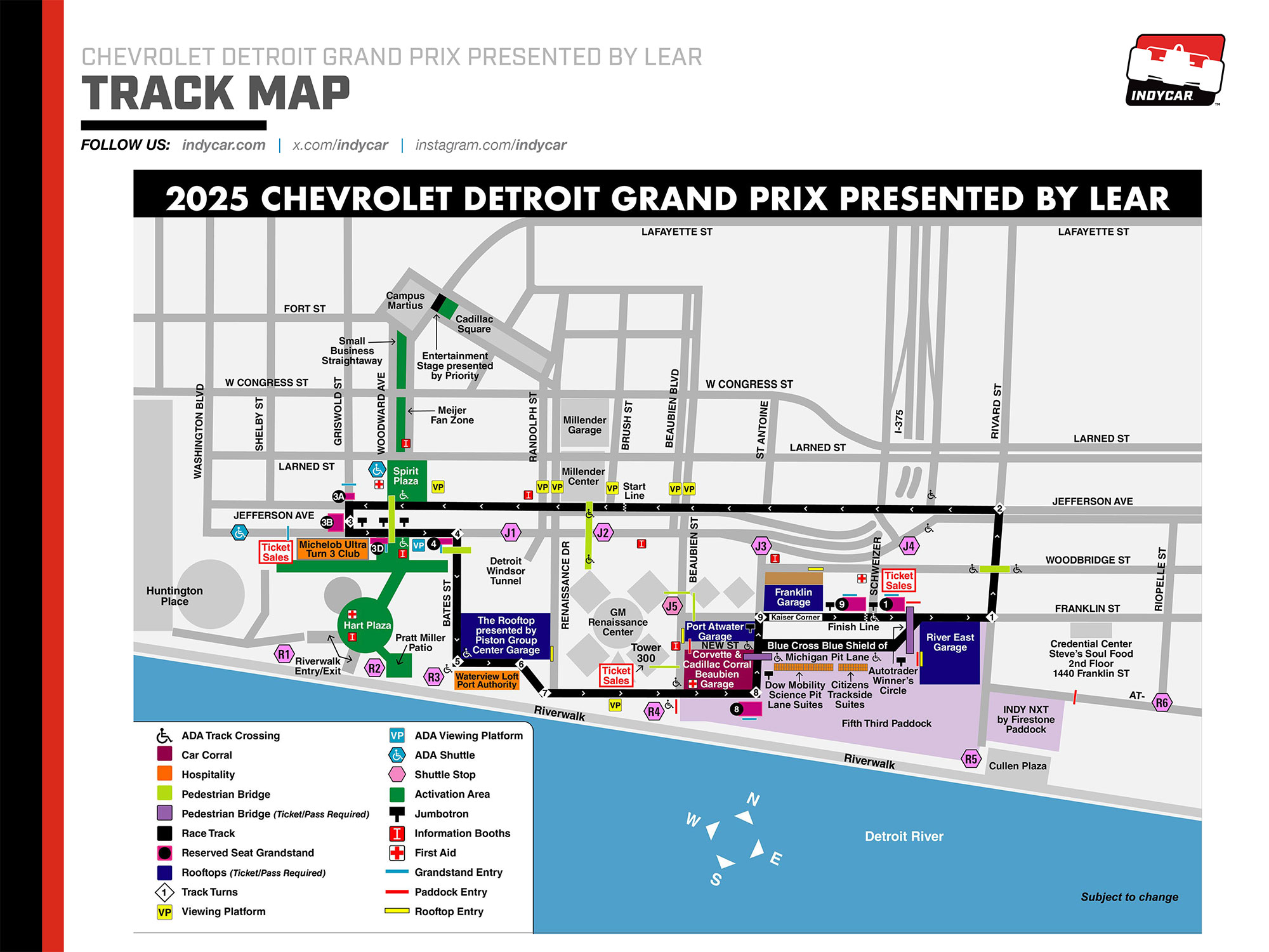 The new era of the Detroit Grand Prix continues as the event returns to the streets of Downtown Detroit from May 30 to June 1, culminating in the Chevrolet Detroit Grand Prix. The new Grand Prix will feature three full days of activities and celebrations on some of Detroit’s most popular and active Downtown areas, including racing on a 1.645-mile, nine-turn street circuit along Jefferson Avenue, Bates Street, Atwater Street, St. Antoine, Franklin Street and Rivard.
